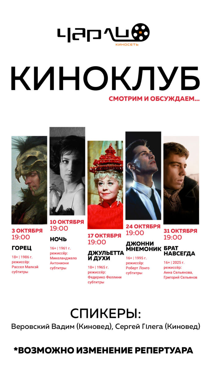 Кино, которое хочется обсудить! Для истинных киноманов авторские, экспериментальные, классические, культовые фильмы в кинотеатре «Чарли». Смотрим, делимся впечатлениями и разбираем фильмы на уровне смысла, эмоций и идей в непринужденной атмосфере Киноклуба.