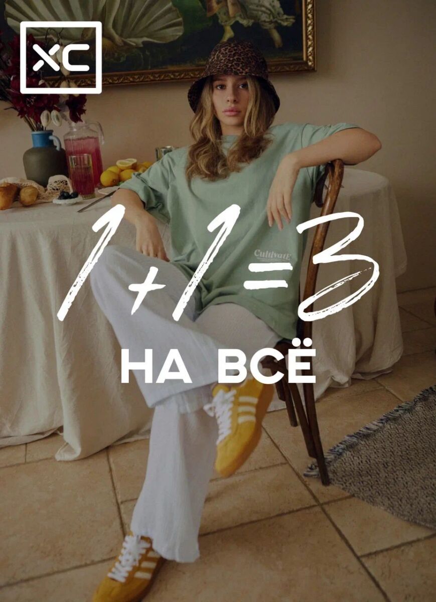 В магазине XC проходит акция 1+1=3 на весь ассортимент.