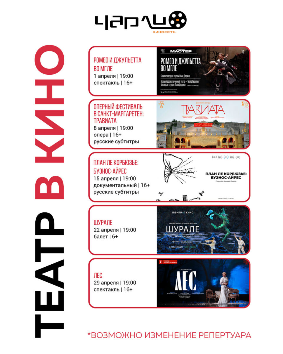 Специально для ценителей искусства! Лучшие мировые балетные, оперные, театральные постановки со сцен легендарных театров и арт-лекторий на большом экране «Чарли». Волшебство искусства рядом.